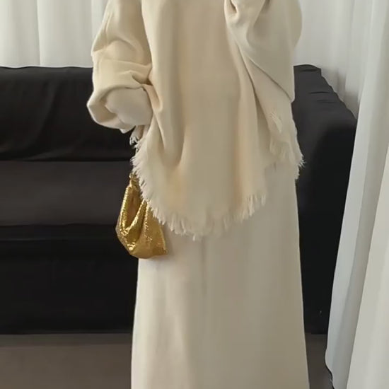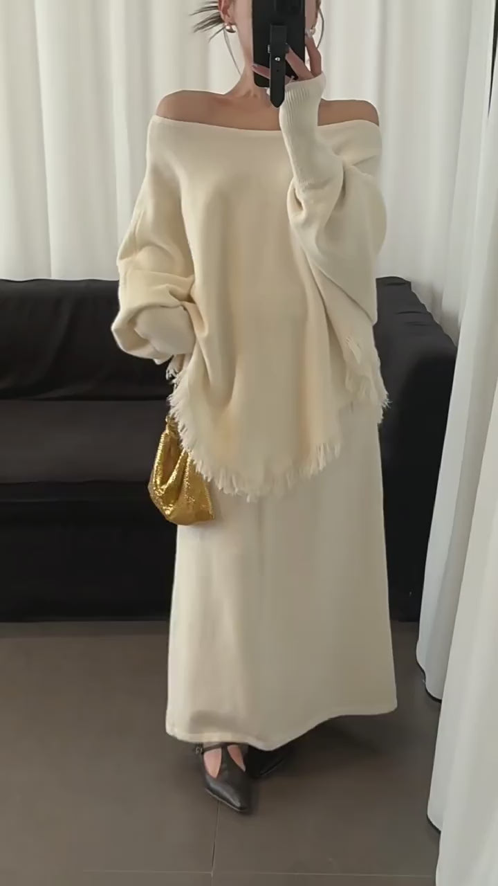 Wrap yourself in effortless elegance with this soft knit set — featuring a soft oversized fringed poncho and a long coordinating skirt.