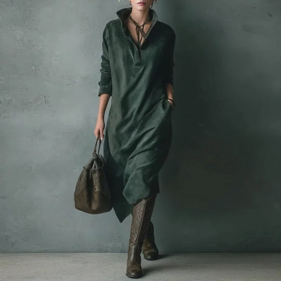 Step into refined comfort with this beautifully tailored long-sleeve dress. Crafted in a soft, velvety fabric, it drapes naturally to flatter every silhouette while offering complete ease of movement. The relaxed collar, subtle V-neckline, and practical side pockets add a polished yet laid-back touch—perfect for both casual days out and elevated evenings.