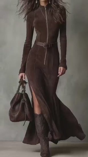 Make an unforgettable entrance with this exquisite brown suede maxi dress, a masterpiece of timeless elegance and modern sophistication. Designed to celebrate the feminine silhouette, it features a flattering fitted cut, a high zip-up neckline, and a matching belt that accentuates the waist with effortless grace.